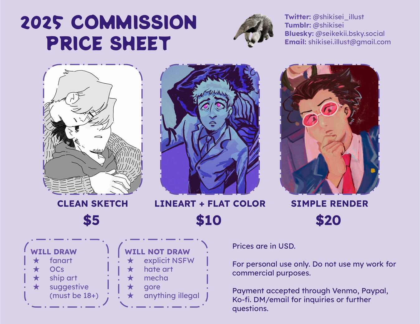 As of OCTOBER 2025, commissions are currently CLOSED! Will be available through Ko-Fi starting in late November. Email or track down one of my social medias to contact me about any inquiries!Prices are subject to change depending on complexity of character. 1/2 of the original price will be added for each additional character.